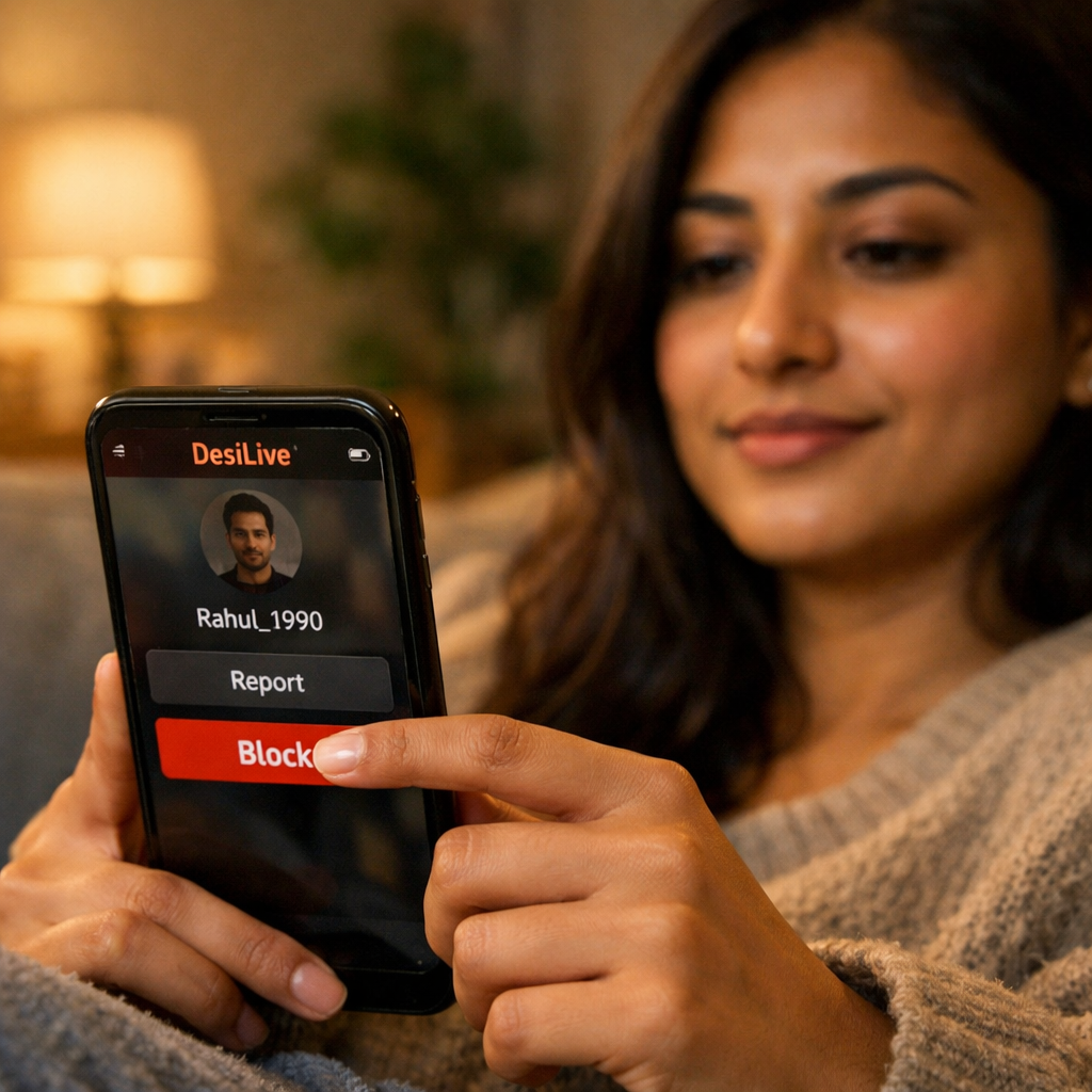Eğer bir görüşme sırasında kendinizi rahatsız, baskı altında veya tehdit edilmiş hissederseniz, nezaketen görüşmeyi sürdürmek zorunda değilsiniz. DesiLive, tek bir dokunuşla karşınızdaki kişiyi engellemenize olanak tanır. Bir kullanıcıyı engellediğinizde, o kişi profilinizi bir daha göremez, size mesaj atamaz veya sizi arayamaz. Dijital ortamda kendi sınırlarınızı korumanın en hızlı yolu olan engelleme butonu, toksik insanları saniyeler içinde dijital alanınızdan uzaklaştırır.